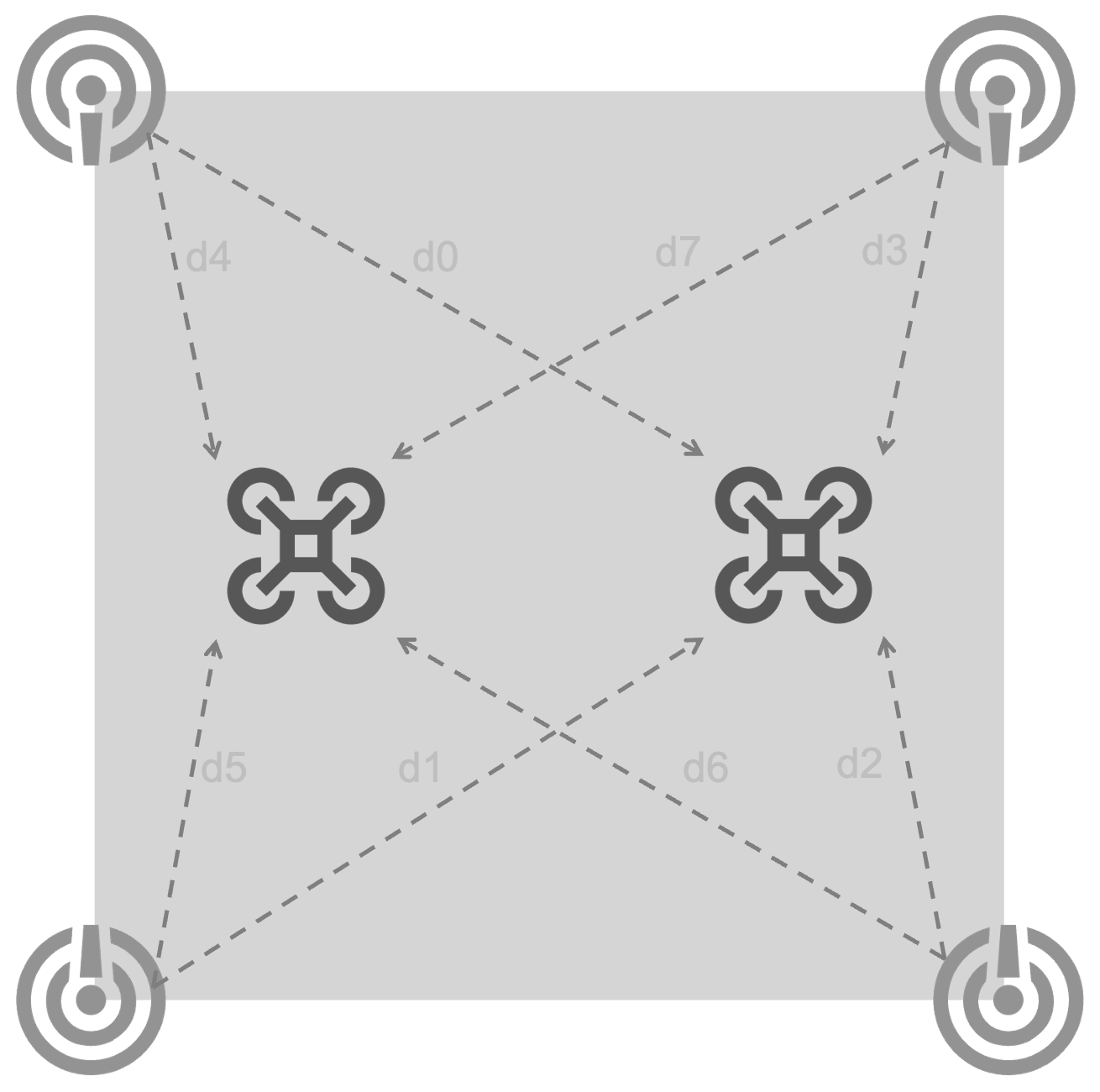 工作原理:通过在基站和无人机(自带标签)之间发送高频无线电信息,测量无人机到每个基站的距离,通过高精度定位算法计算出标签的位置,即无人机在三维空间中的精确坐标。