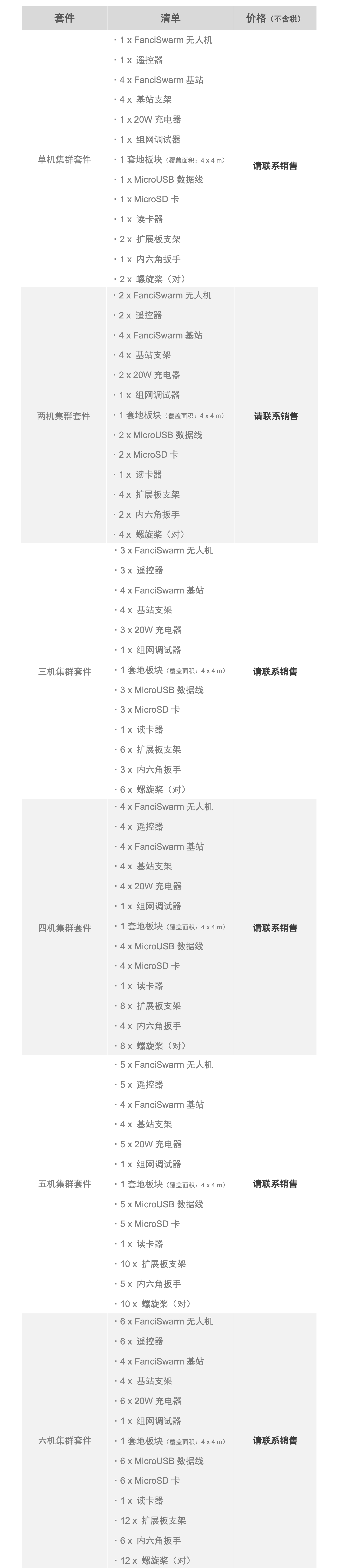 构成:由4台FanciSwarm™基站、1架或多架FanciSwarm™无人机(自带标签)以及高精度定位算法构成。