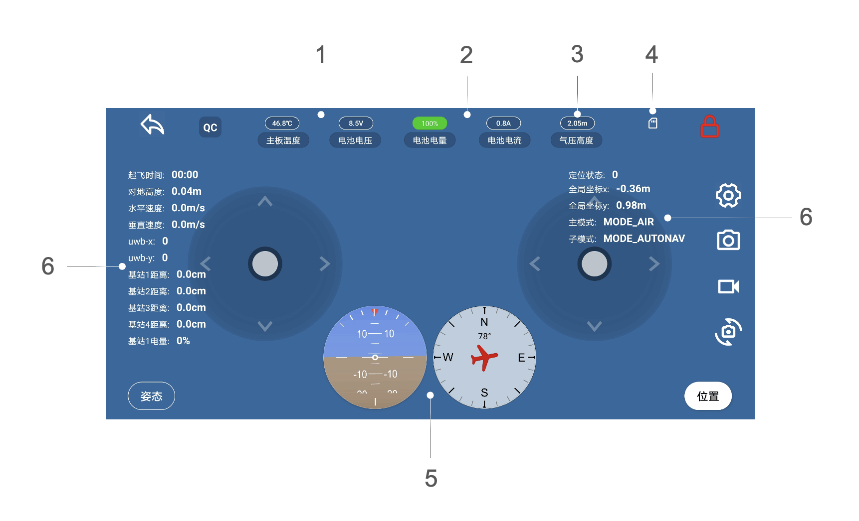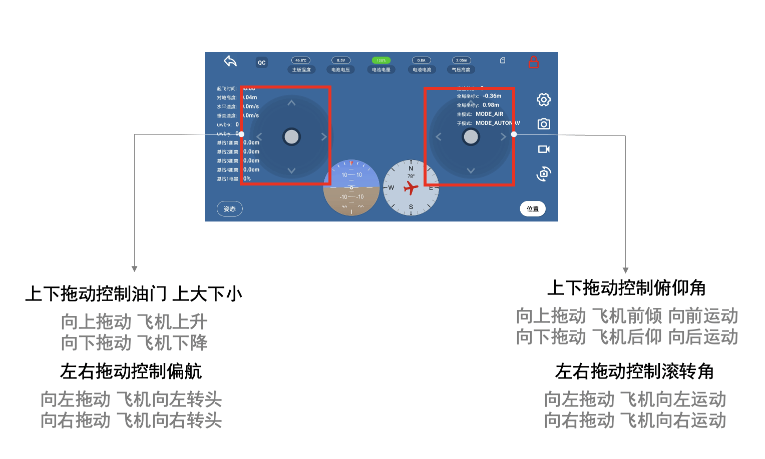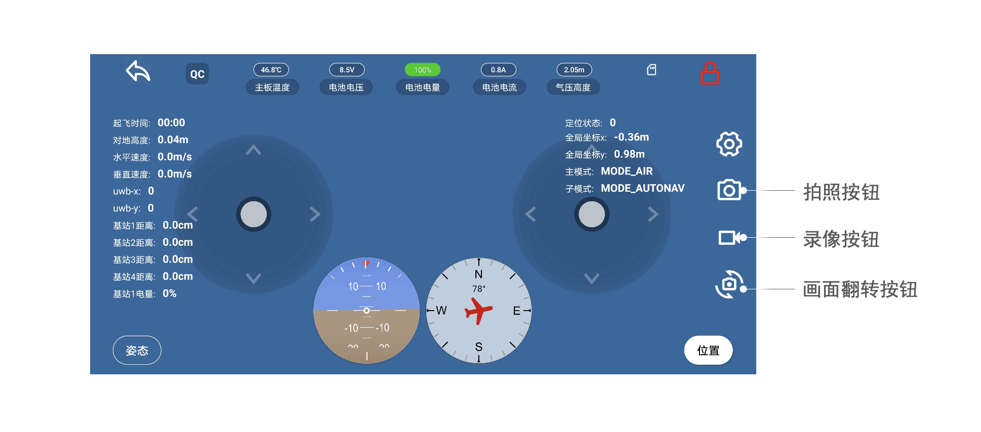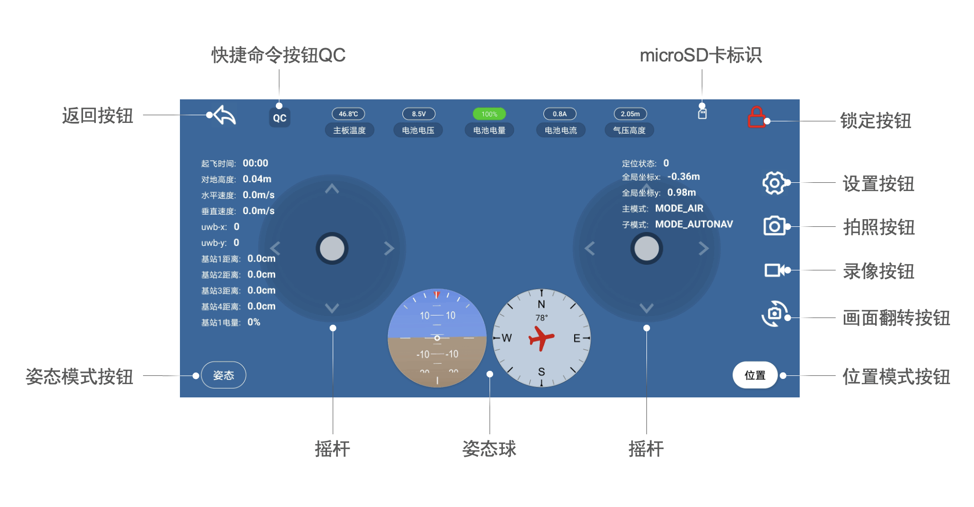 FanciSwarm App UI界面简洁舒适,功能按钮简单易用,快速便捷调参、状态精准监测、体感遥控、实时图传、拍照录像......并配套详细的使用指南。