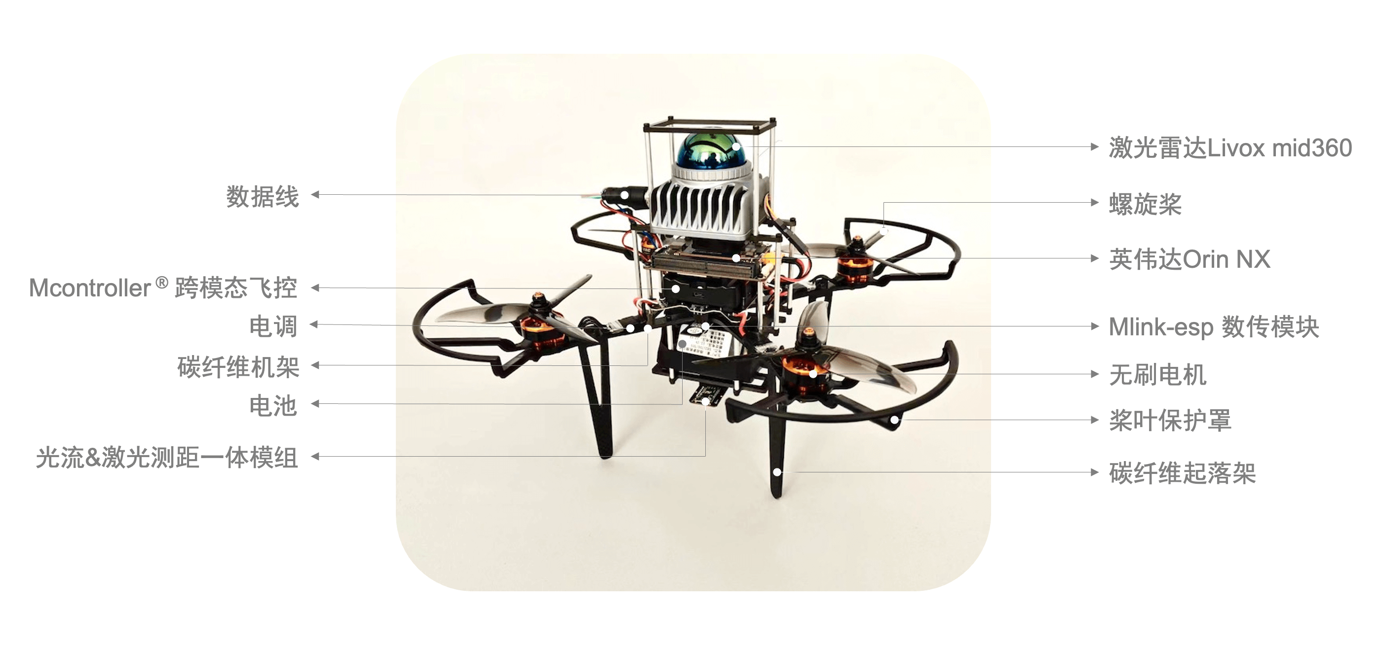 构成:由FanciSwarm® Pro集群无人机、定制款碳纤维载荷支架、碳纤维保护框、Orin NX或者Orin Nano核心板以及底板、激光雷达Livox mid360、深度相机D435(选配)、单目RGB相机(选配)、高精度GNSS模组(选配)、512g固态硬盘、散热风扇等构成,调试安装好,整机发货。